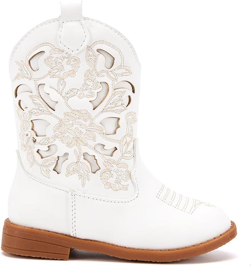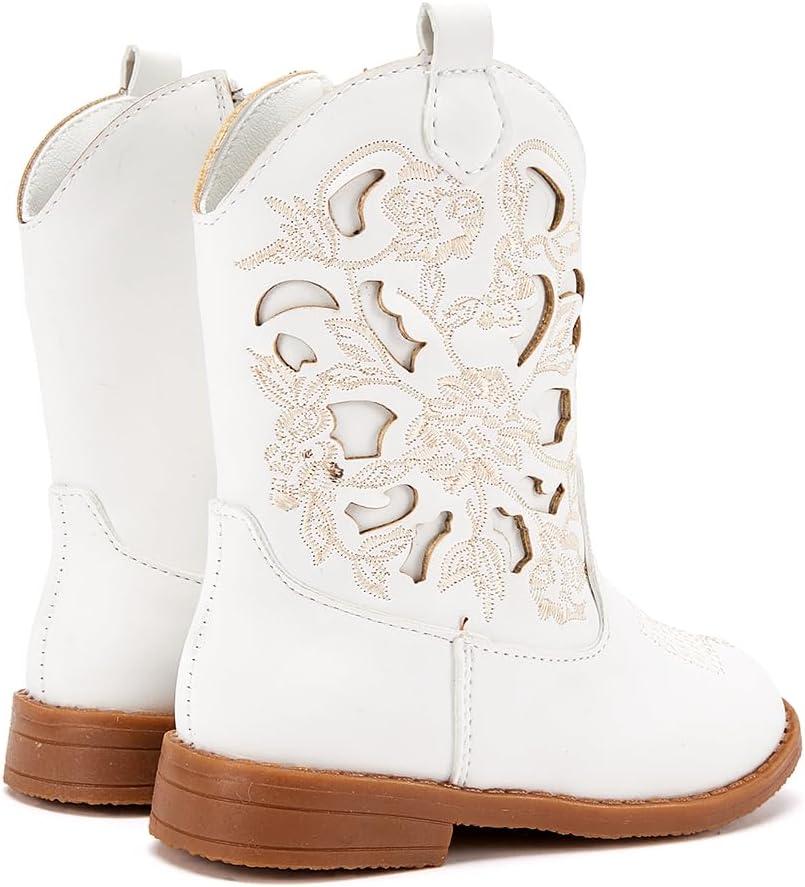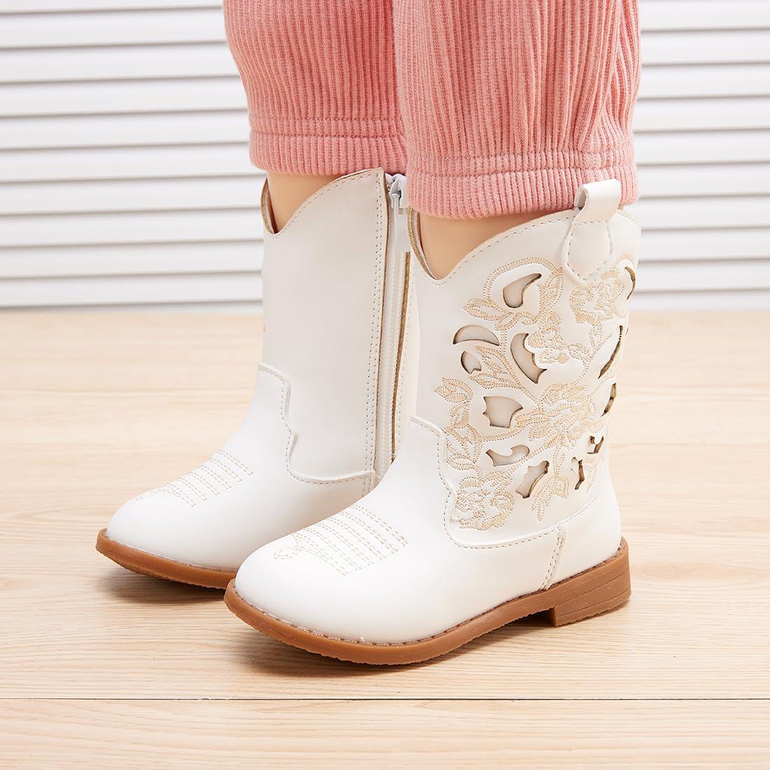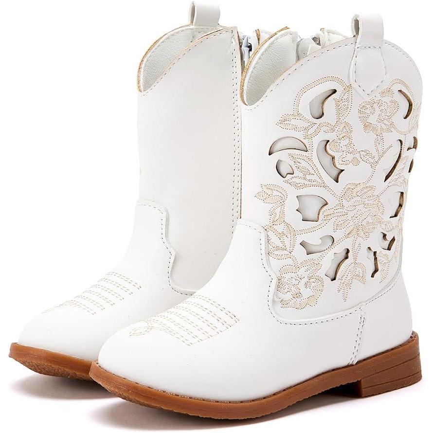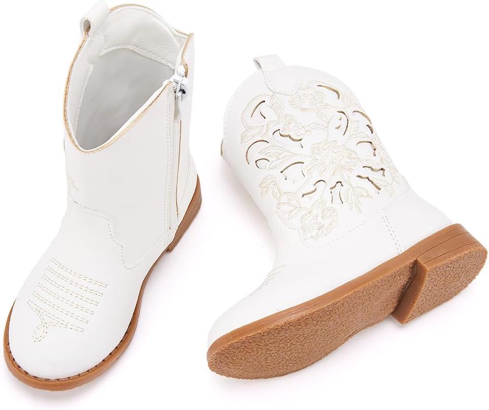 BMCiTYBM Girls Cowgirl Boots Unisex-Child Mid Calf Toddler Cowboy Boots Little Kids Western Boots Round Toe All Seasons Shoes(3-white)