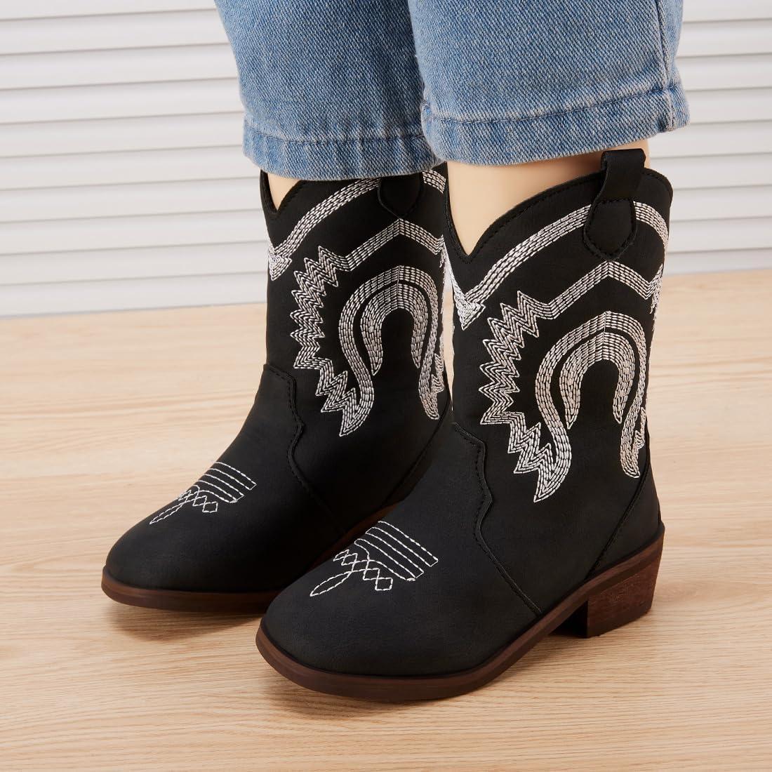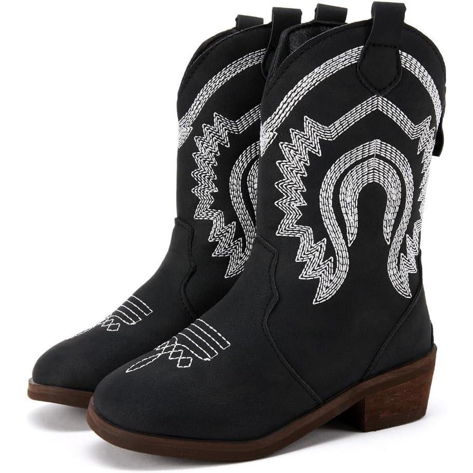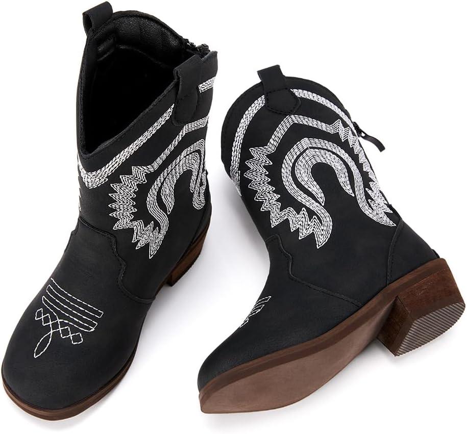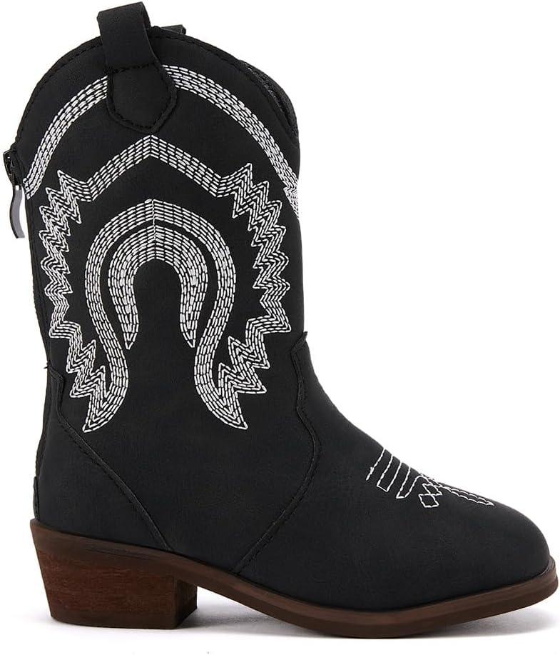 BMCiTYBM Girls Cowgirl Boots Unisex-Child Mid Calf Toddler Cowboy Boots Little Kids Western Boots Round Toe All Seasons Shoes(All-black)