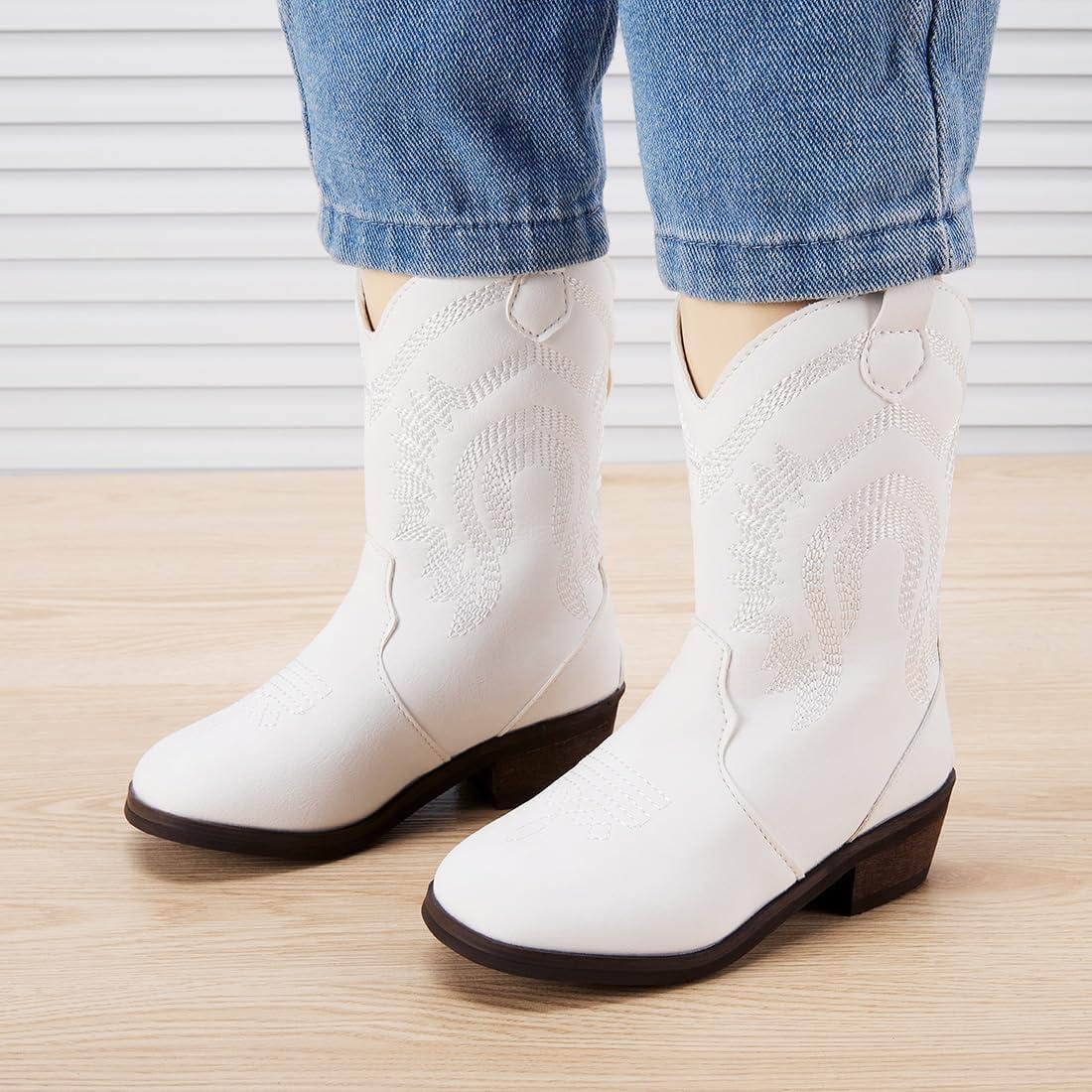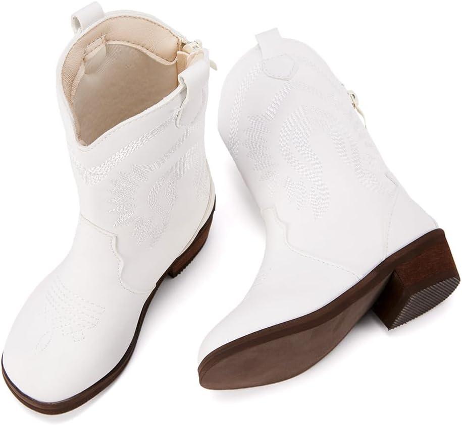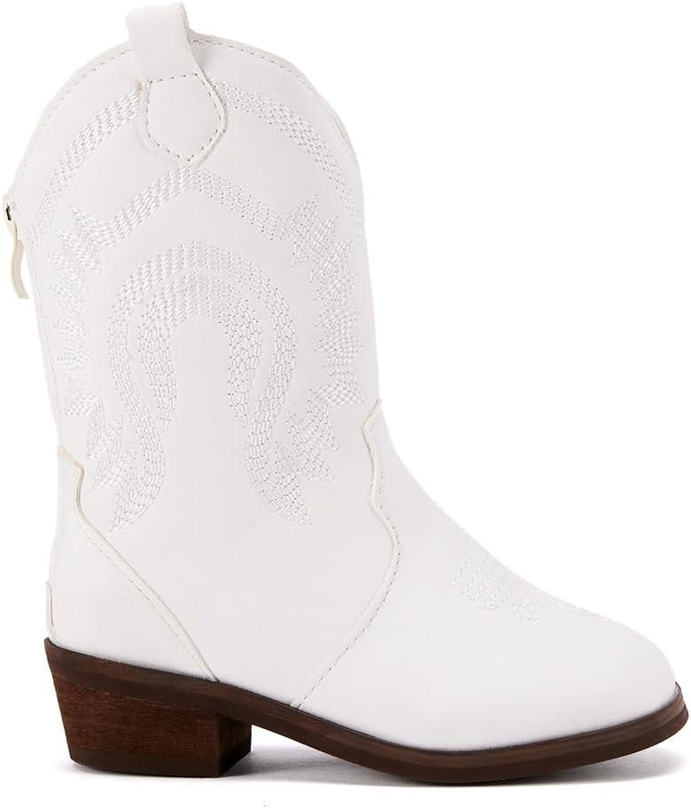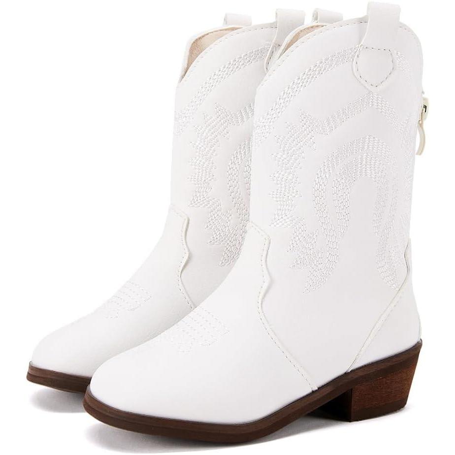 BMCiTYBM Girls Cowgirl Boots Unisex-Child Mid Calf Toddler Cowboy Boots Little Kids Western Boots Round Toe All Seasons Shoes(All-white)