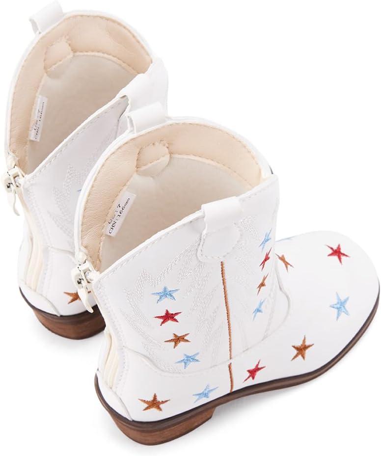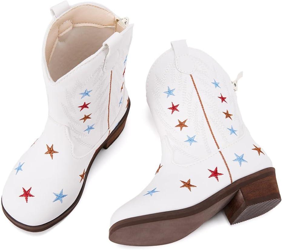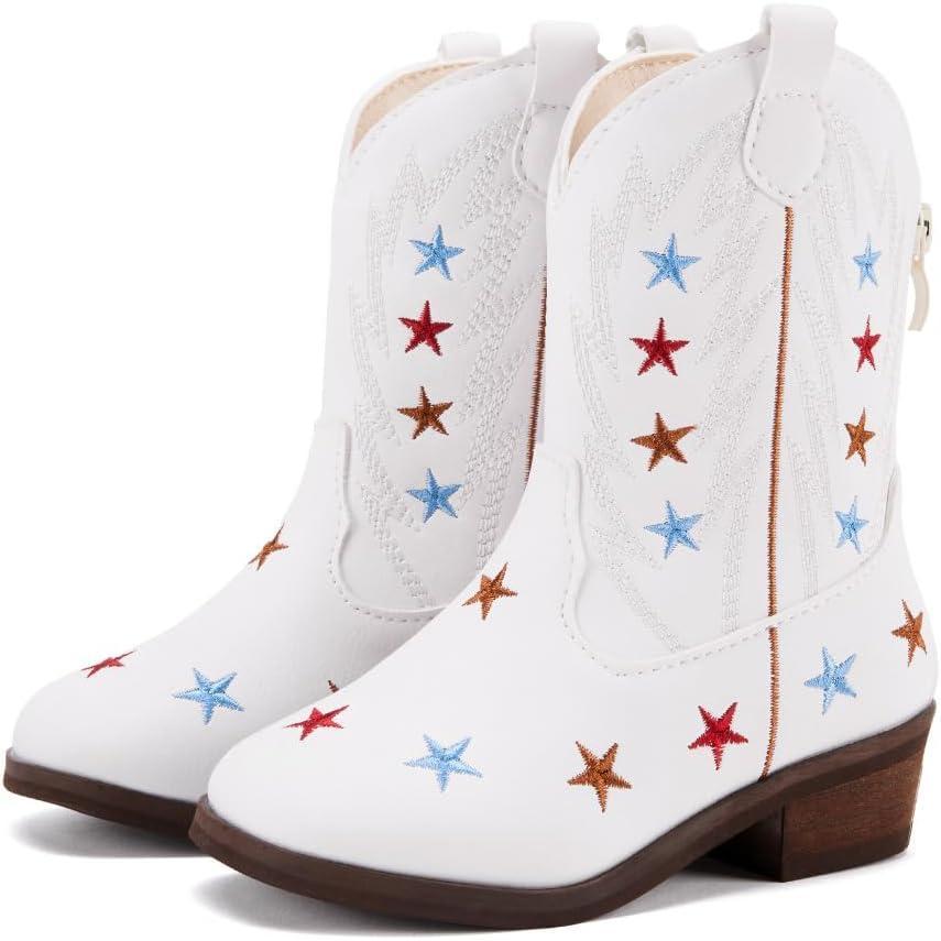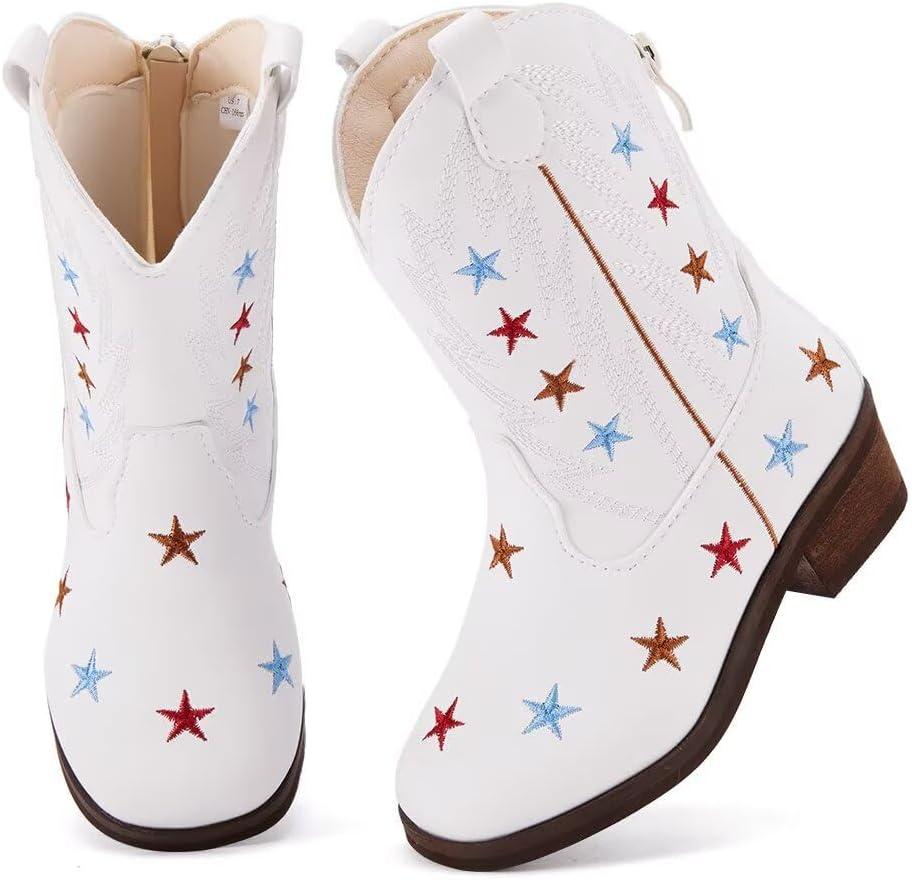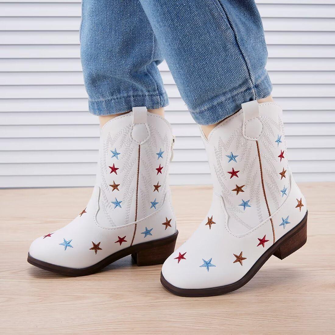 BMCiTYBM Girls Cowgirl Boots Unisex-Child Mid Calf Toddler Cowboy Boots Little Kids Western Boots Round Toe All Seasons Shoes(Multi-white)