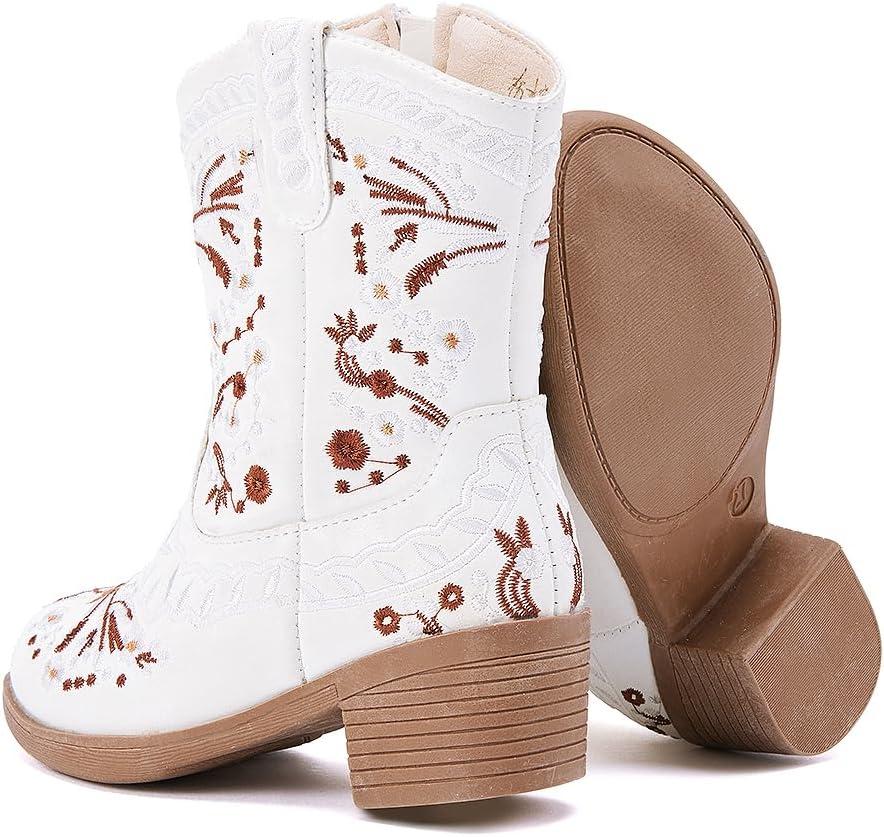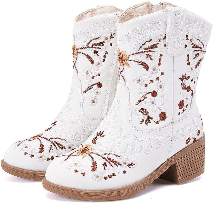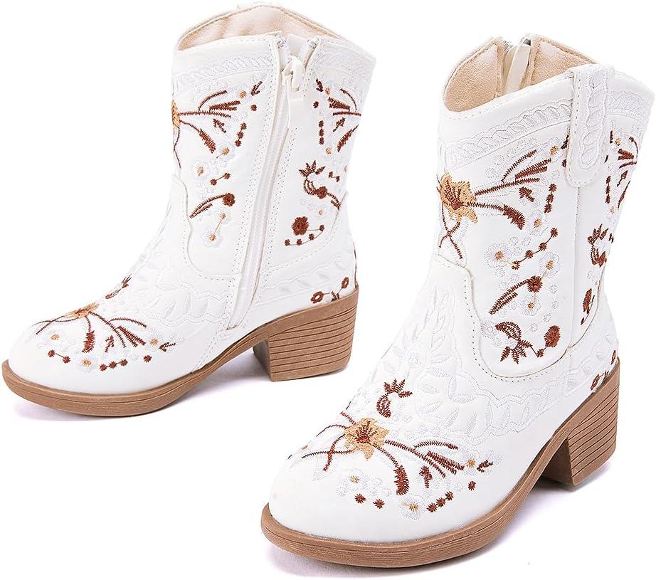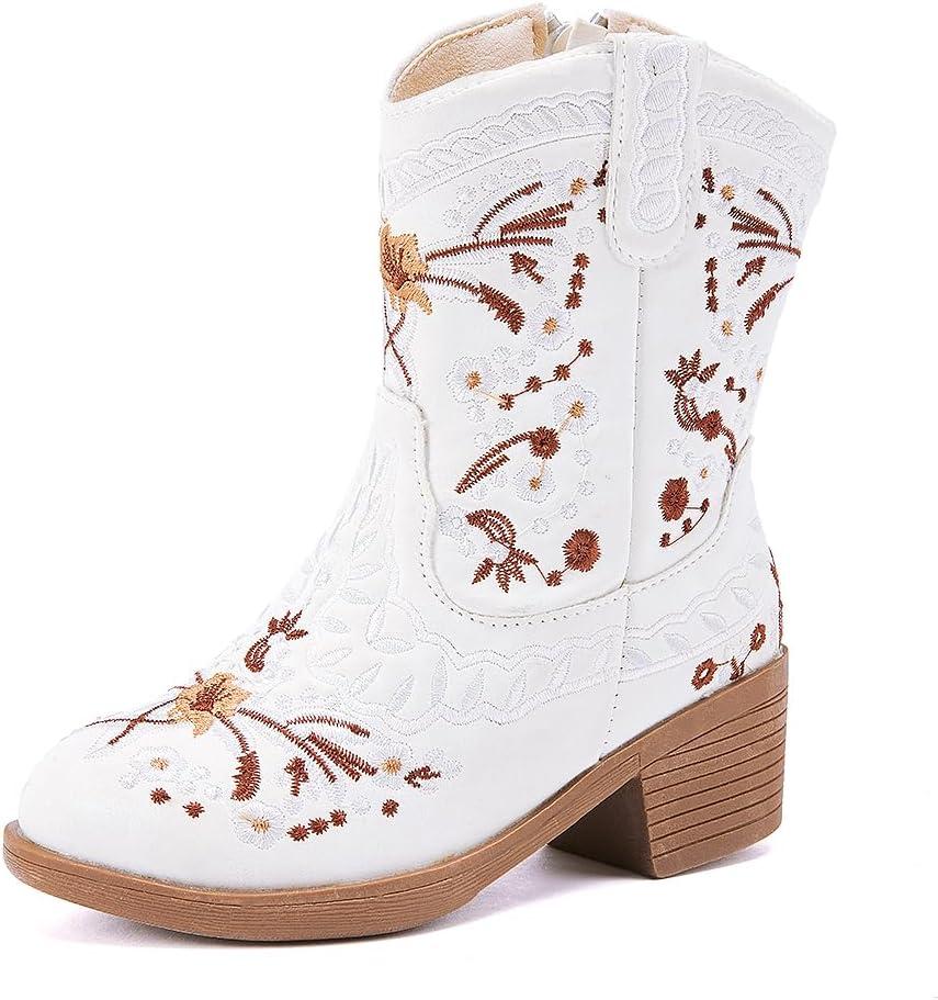 BMCiTYBM Girls Cowgirl Boots Unisex-Child Mid Calf Toddler Cowboy Boots Little Kids Western Boots Round Toe All Seasons Shoes(White)
