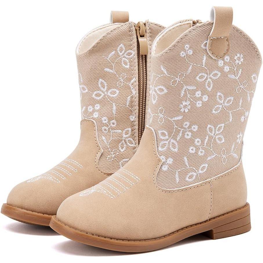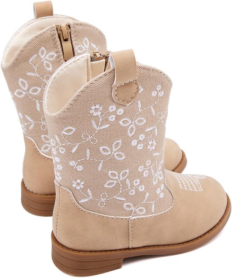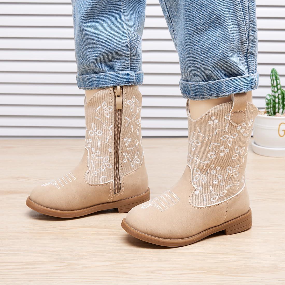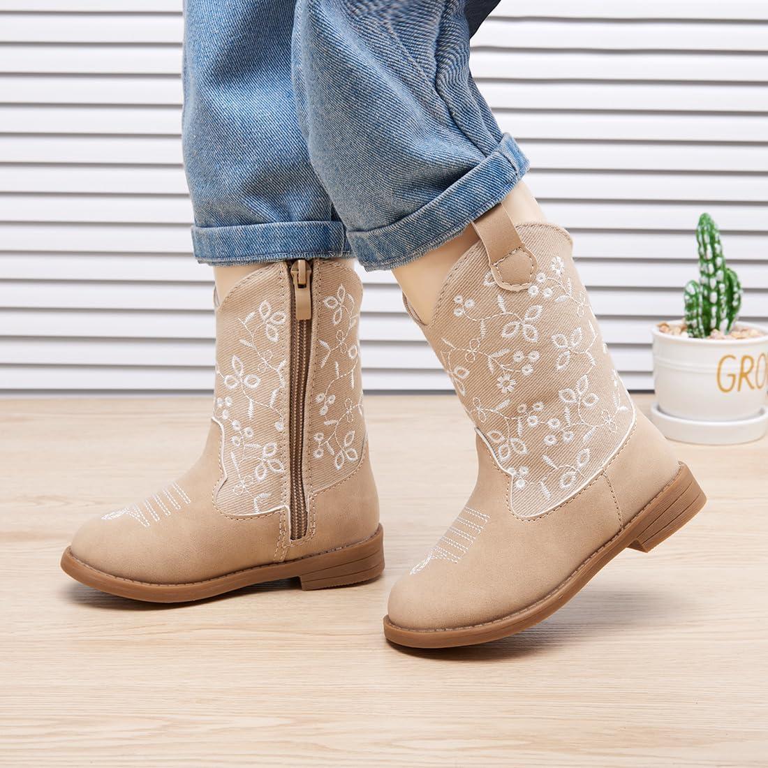 BMCiTYBM Toddler Girls Cowgirl Boots Little Kids Mid Calf Western Flower Cowboy Pointed Toe Riding Shoes All Season(4-camel)