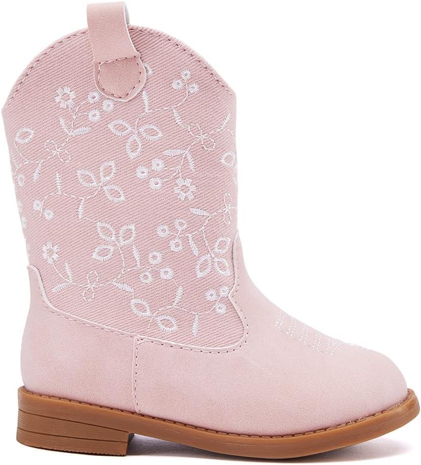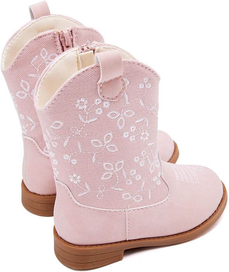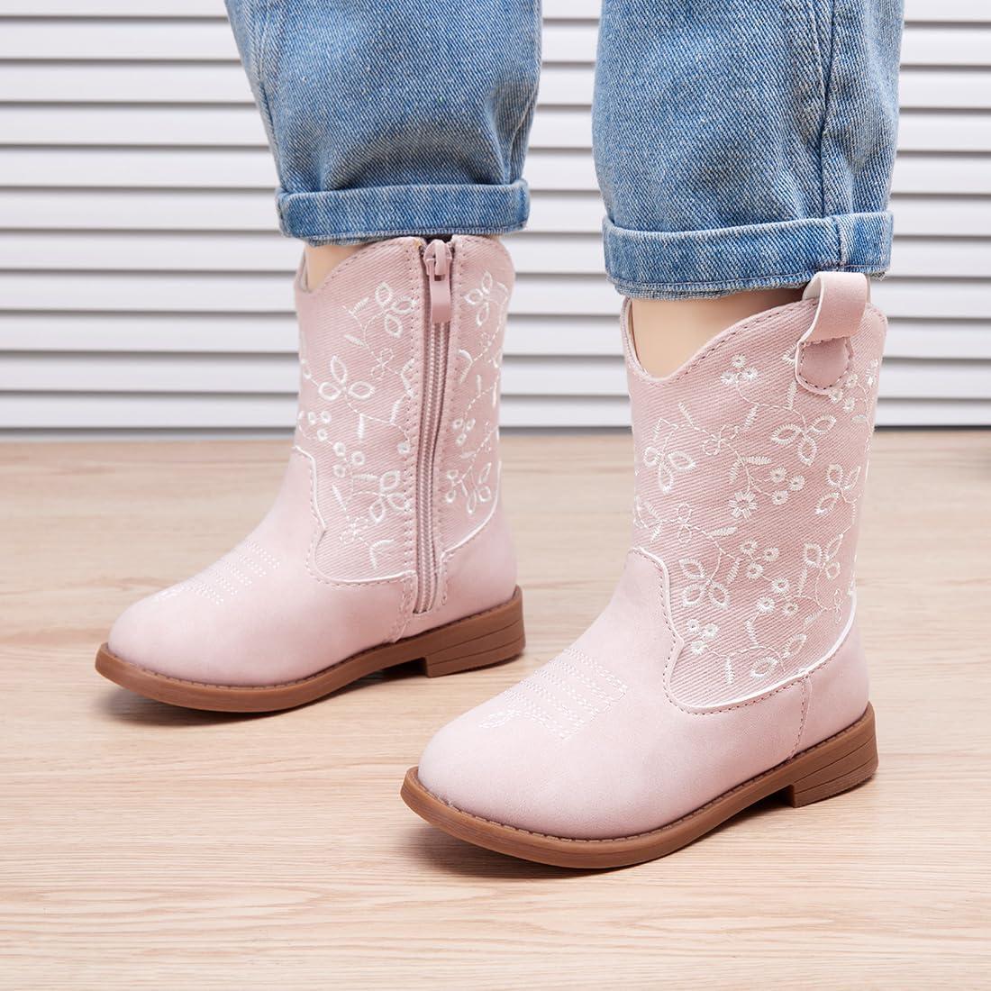 BMCiTYBM Toddler Girls Cowgirl Boots Little Kids Mid Calf Western Flower Cowboy Pointed Toe Riding Shoes All Season(4-pink)